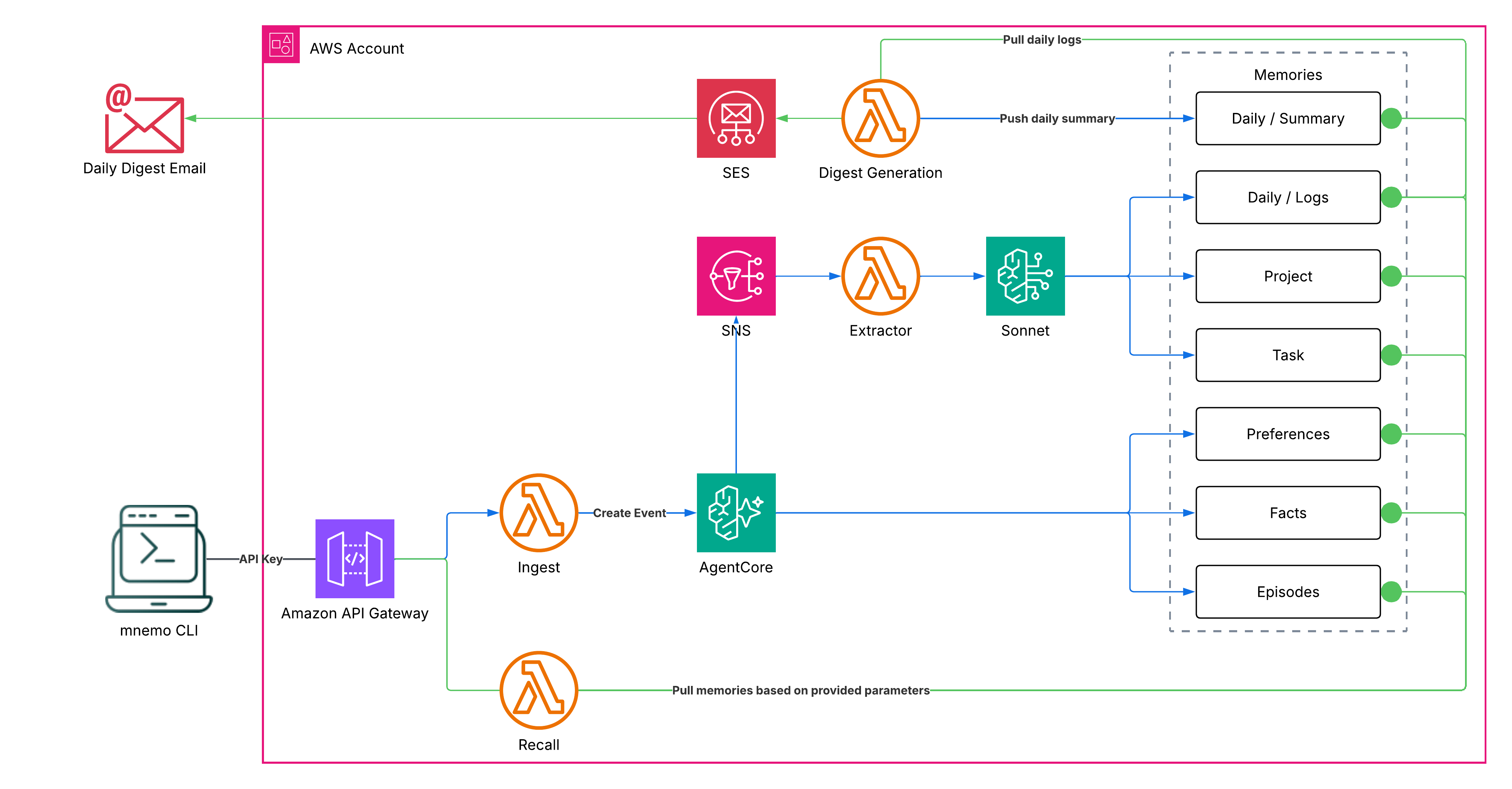 mnemo is on GitHub. It deploys as a CDK stack to your AWS account and takes about 10 minutes to set up. You'll need Node.js 22+, an AWS account with CDK bootstrapped, and Bedrock AgentCore Memory access enabled in your region. The whole system runs on serverless (API Gateway, Lambda, SNS, S3, AgentCore), so cost scales with usage.